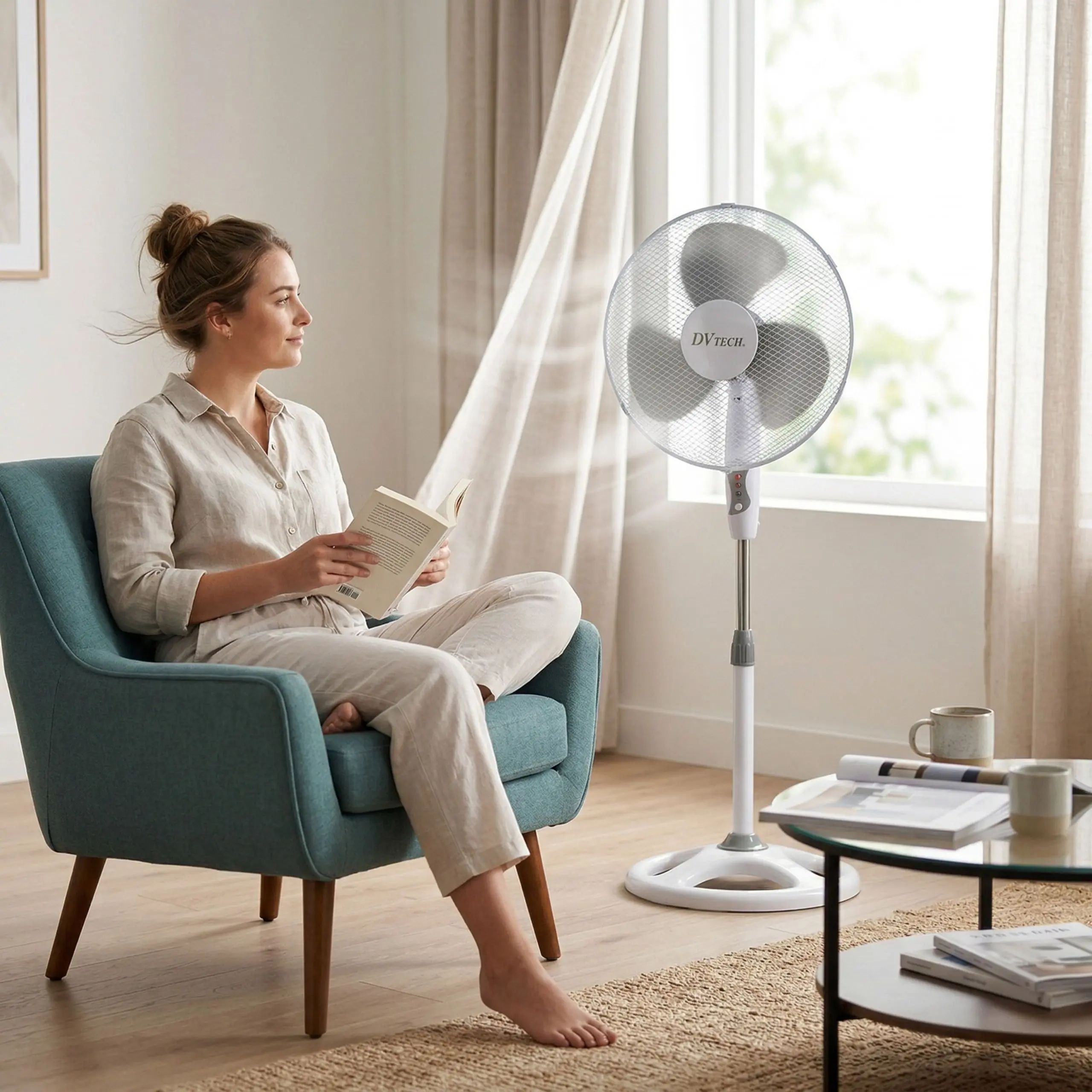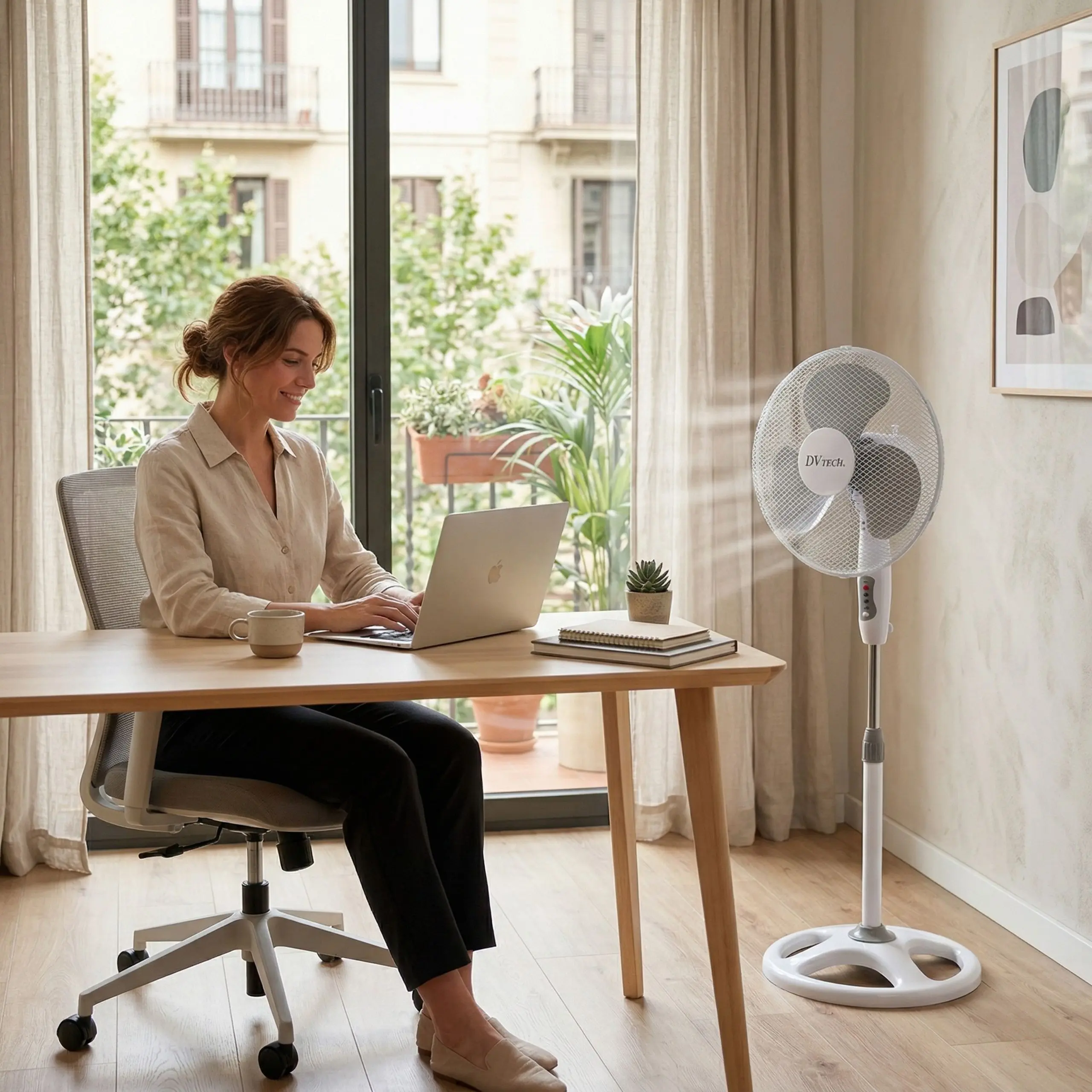 Disfruta de un ambiente fresco y relajante con el ventilador de pie DVTECH. Diseñado para ofrecer un flujo de aire potente pero extremadamente silencioso, es el aliado perfecto para combatir el calor en cualquier habitación, desde la oficina hasta el dormitorio, sin interrumpir tu descanso ni tus actividades.
