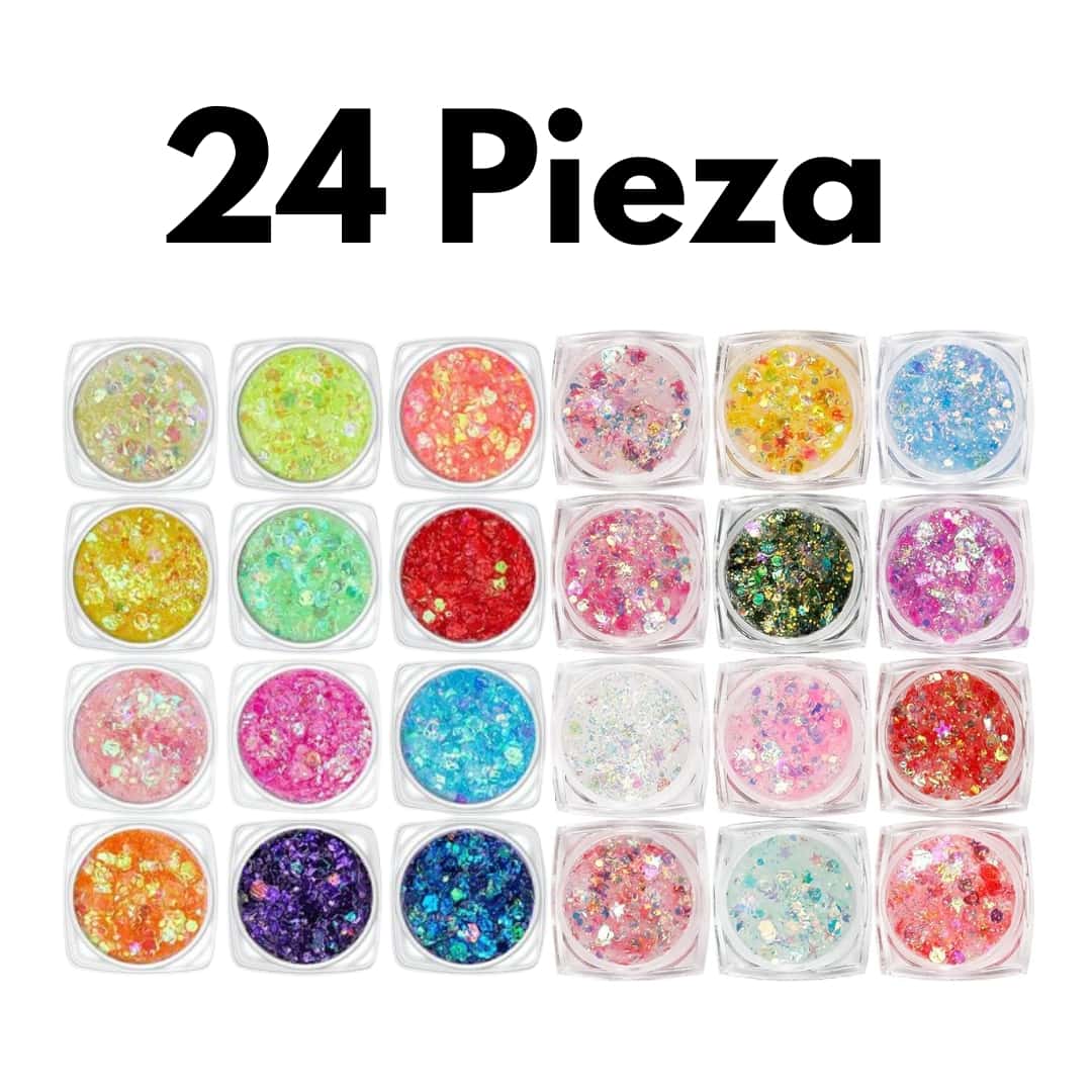 • 24 tonos individuales de gel con glitter UV
